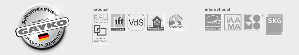 Der hohe Qualitäts- & Sicherheitsstandard der GAYKO-Fenster & Türen wird seit Jahren von führenden Instituten bestätigt. Alle GAYKO-Fenster & Türen sind durchgängig geprüft und zertifiziert: